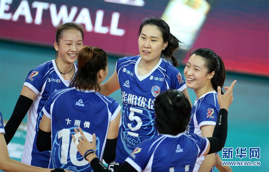 9月30日,上海光明优倍队球员在比赛中庆祝得分。 当日,在广东江门举行的2020年全国女排锦标赛第二阶段交叉赛中,上海光明优倍队以3比0战胜辽宁华君队。 新华社记者秦朗摄