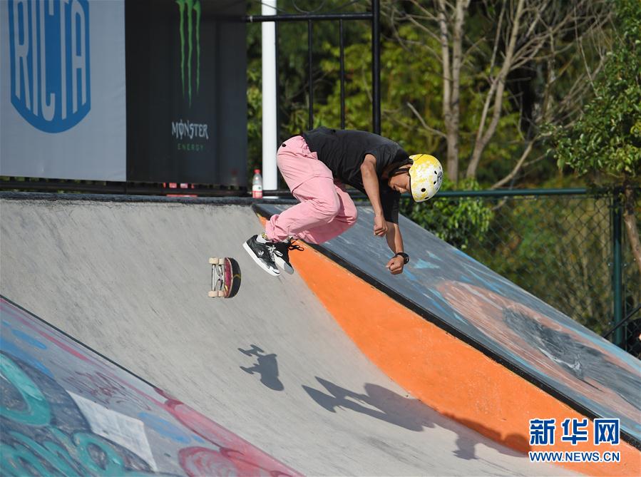 9月30日,贵州队选手苏建军在男子街式预赛中,他以31分获得预赛第二名进入决赛。 当日,中国·安徽滑板公开赛男子街式预赛在安徽省潜山市源潭镇展开角逐。 新华社记者 周牧 摄