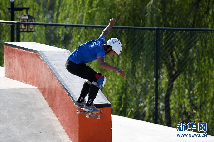 9月30日,贵州队选手陈荣贵在男子街式预赛中,他以32分获得预赛第一名进入决赛。 当日,中国·安徽滑板公开赛男子街式预赛在安徽省潜山市源潭镇展开角逐。 新华社记者 周牧 摄