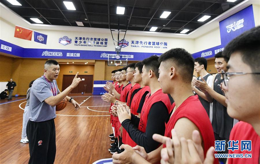 10月8日,天津先行者队主教练刘铁(左)在公开训练课上讲话。 当日,天津荣钢先行者篮球俱乐部邀请天津市双港中学校篮球队的学生与俱乐部球员在天津先行者篮球公园共同参加了一场公开训练课,这也标志着天津先行者篮球公园正式投入使用。据了解,俱乐部将在篮球公园开设课程并委派驻场教练,将其打造成为青少年篮球训练营,进一步普及篮球运动。 新华社记者 李然 摄