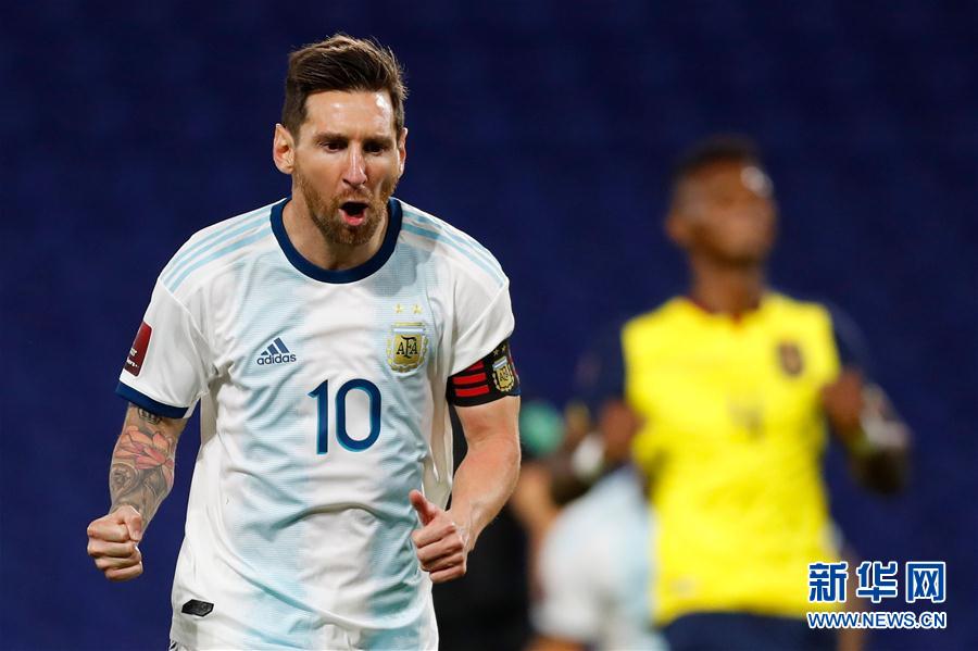 10月8日,阿根廷队球员梅西在比赛中庆祝进球。 当日,在2022年世界杯南美区预选赛首轮比赛中,阿根廷队以1比0战胜厄瓜多尔队。 新华社/法新