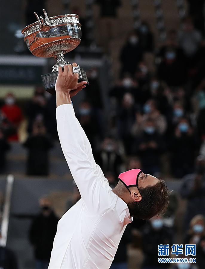 10月11日,纳达尔在颁奖仪式上捧杯庆祝。 当日,在法国巴黎进行的2020年法国网球公开赛男单决赛中,西班牙选手纳达尔以3比0战胜塞尔维亚选手焦科维奇,夺得冠军。 新华社记者 高静 摄