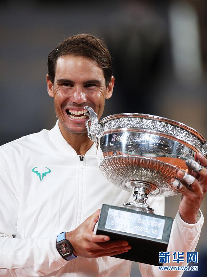 10月11日,纳达尔在颁奖仪式上和奖杯合影。 当日,在法国巴黎进行的2020年法国网球公开赛男单决赛中,西班牙选手纳达尔以3比0战胜塞尔维亚选手焦科维奇,夺得冠军。 新华社记者 高静 摄