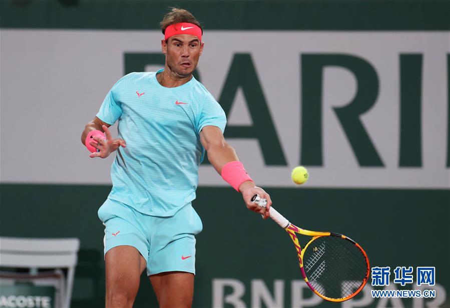 10月11日,纳达尔在比赛中回球。 当日,在法国巴黎进行的2020年法国网球公开赛男单决赛中,西班牙选手纳达尔以3比0战胜塞尔维亚选手焦科维奇,夺得冠军。 新华社记者 高静 摄