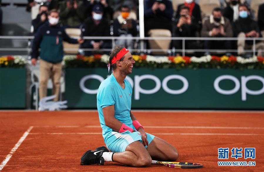10月11日,纳达尔在比赛后庆祝夺冠。 当日,在法国巴黎进行的2020年法国网球公开赛男单决赛中,西班牙选手纳达尔以3比0战胜塞尔维亚选手焦科维奇,夺得冠军。 新华社记者 高静 摄