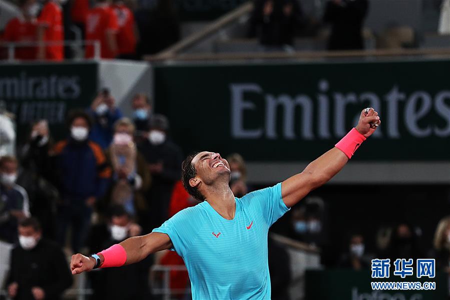 10月11日,纳达尔在比赛后庆祝夺冠。 当日,在法国巴黎进行的2020年法国网球公开赛男单决赛中,西班牙选手纳达尔以3比0战胜塞尔维亚选手焦科维奇,夺得冠军。 新华社记者 高静 摄