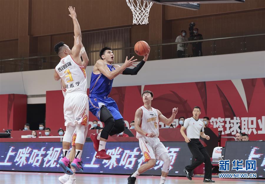 10月13日,天津先行者队球员金鑫(左二)在比赛中上篮。 当日,在浙江省诸暨市举行的2020-2021赛季中国男子篮球职业联赛(CBA)季前赛中,天津先行者队以76比70战胜深圳马可波罗队。 新华社发(郭斌 摄)