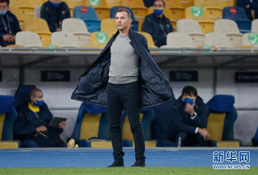 10月13日,乌克兰队主教练舍甫琴科在场边观战。 当日,在乌克兰基辅举行的欧足联国家足球联赛A级第四组第四轮的比赛中,乌克兰队主场以1比0战胜西班牙队。 新华社/路透