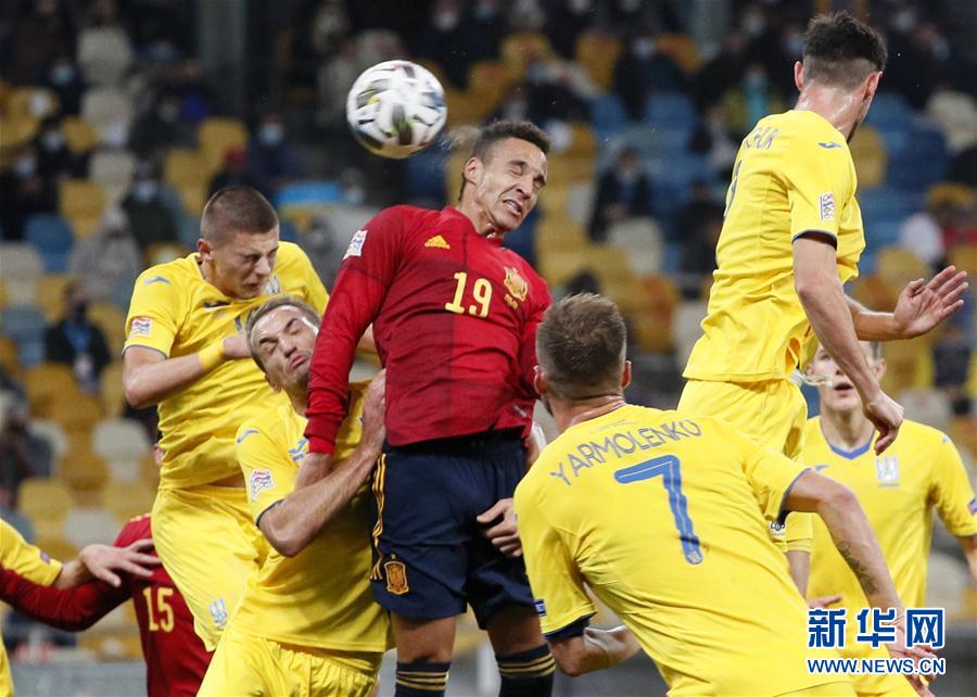 10月13日,西班牙队球员罗德里戈(中)在比赛中争顶。 当日,在乌克兰基辅举行的欧足联国家足球联赛A级第四组第四轮的比赛中,乌克兰队主场以1比0战胜西班牙队。 新华社/路透