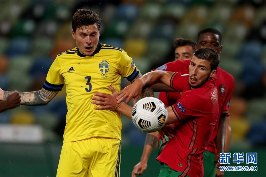 10月14日,葡萄牙队球员迪亚斯(前右)在比赛中防守瑞典队球员林德洛夫。 当日,在葡萄牙里斯本举行的欧足联国家联赛A级第3组第四轮的比赛中,葡萄牙队主场以3比0战胜瑞典队。 新华社发(佩德罗·菲乌萨摄)