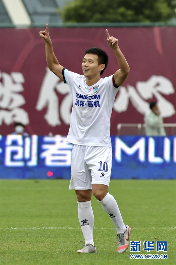 10月15日,南通支云队球员徐骏敏进球后庆祝。 当日,在2020中国足球协会甲级联赛第一阶段(常州赛区)第10轮比赛中,南通支云队以1比1战平黑龙江FC队。 新华社发(史康 摄)