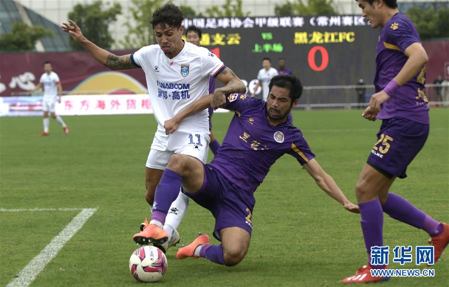 10月15日,南通支云队球员查加斯(前左)与黑龙江FC队球员孙一凡拼抢。 当日,在2020中国足球协会甲级联赛第一阶段(常州赛区)第10轮比赛中,南通支云队以1比1战平黑龙江FC队。 新华社发(史康 摄)