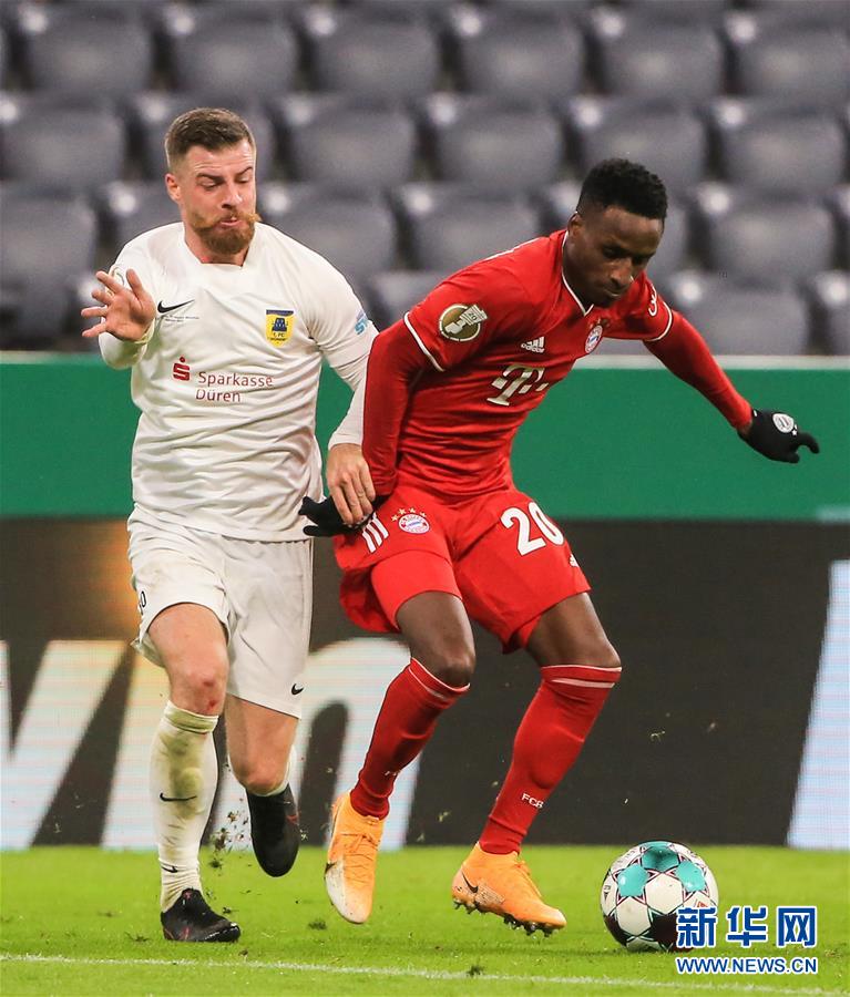 10月15日,拜仁慕尼黑队球员布纳·萨尔(右)与迪伦队球员维珀菲尔特在比赛中拼抢。 当日,在德国慕尼黑举行的2020-2021赛季德国杯首轮比赛中,拜仁慕尼黑队以3比0战胜迪伦队,晋级第二轮。 新华社发(菲利普·鲁伊兹摄)