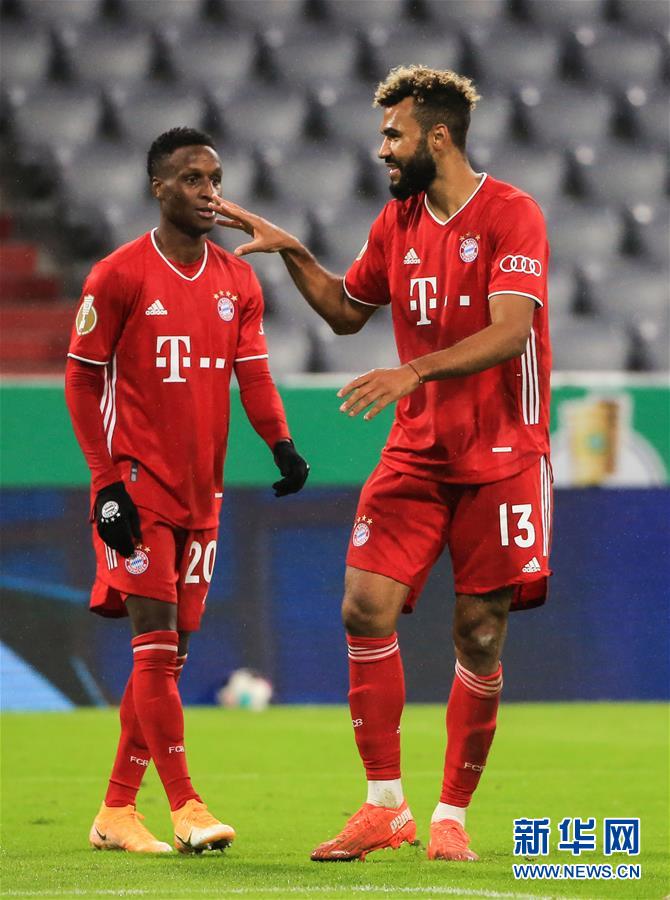 10月15日,拜仁慕尼黑队球员舒波·莫廷(右)庆祝自己本场比赛的首粒进球。当日,在德国慕尼黑举行的2020-2021赛季德国杯首轮比赛中,拜仁慕尼黑队以3比0战胜迪伦队,晋级第二轮。 新华社发(菲利普·鲁伊兹摄)