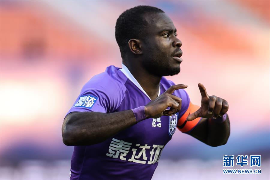 10月16日,天津泰达队球员阿奇姆彭进球后庆祝。 当日,在2020中国足球协会超级联赛第二阶段(大连赛区)首场比赛中,天津泰达队以2比0战胜深圳佳兆业队,获得本赛季首场胜利。 新华社记者潘昱龙摄