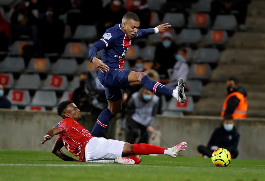 10月16日,巴黎圣日耳曼队球员姆巴佩(上)带球突破尼姆队球员比尔内。 当日,在2020-2021赛季法国足球甲级联赛第7轮比赛中,巴黎圣日耳曼队客场以4比1战胜尼姆队。 新华社/路透