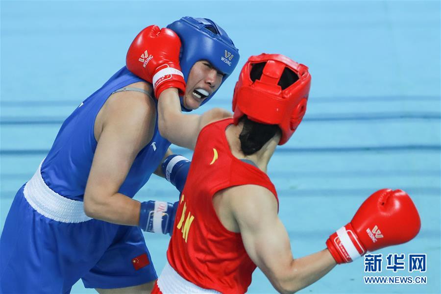 10月18日,内蒙古队选手李倩(右)与黑龙江队选手汪丽娜在女子75公斤级预赛中。 当日,2020年“迁安杯”全国女子拳击锦标赛在河北省迁安市唐山九江体育中心进行第二日比赛。在75公斤级预赛中,内蒙古队选手李倩以5比0战胜黑龙江队选手汪丽娜,晋级下一轮。 新华社记者 欧东衢 摄