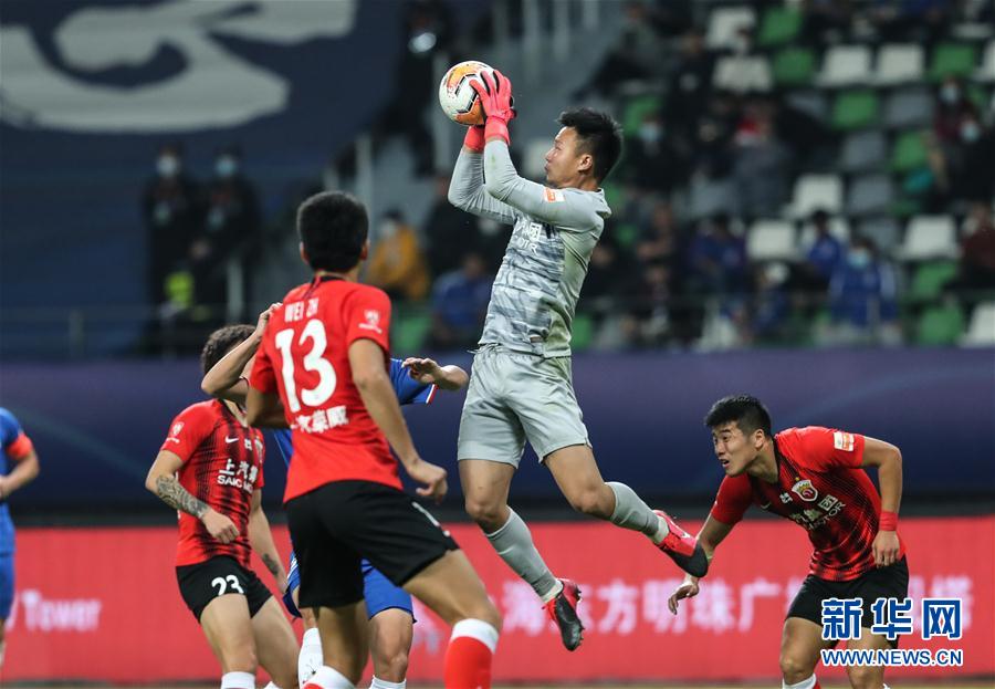 10月18日,上海上港队守门员陈威(右二)在比赛中出击。 当日,在2020赛季中国足球协会超级联赛(苏州赛区)第15轮比赛中,上海绿地申花队以0比0战平上海上港队。 新华社记者 杨磊 摄