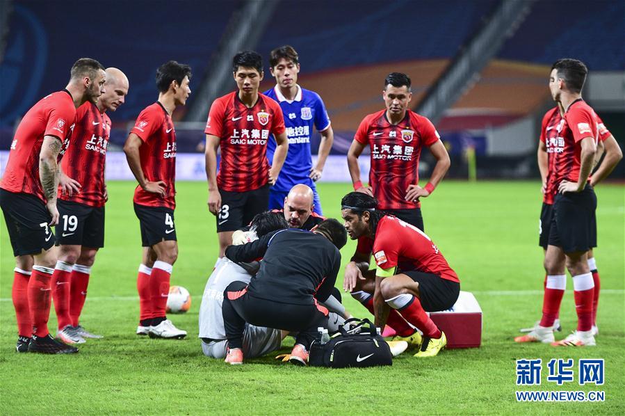 10月18日,上海上港队队医查看守门员颜骏凌的伤势。 当日,在2020赛季中国足球协会超级联赛(苏州赛区)第15轮比赛中,上海绿地申花队以0比0战平上海上港队。 新华社记者 许畅 摄