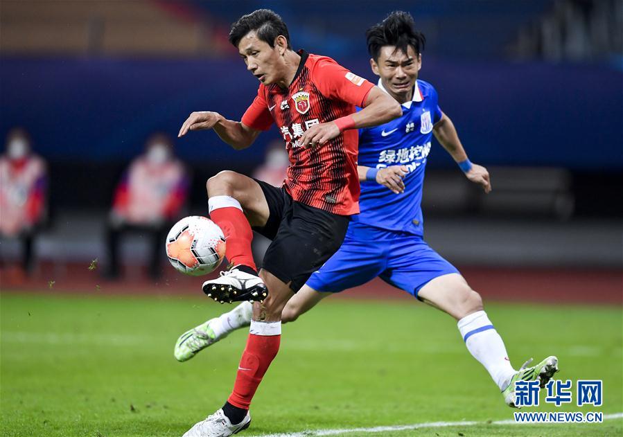 10月18日,上海上港队球员王燊超(左)在比赛中射门。 当日,在2020赛季中国足球协会超级联赛(苏州赛区)第15轮比赛中,上海绿地申花队以0比0战平上海上港队。 新华社记者 许畅 摄