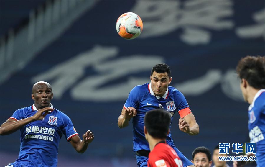 10月18日,上海绿地申花队球员莫雷诺(中)在比赛中争抢头球。 当日,在2020赛季中国足球协会超级联赛(苏州赛区)第15轮比赛中,上海绿地申花队以0比0战平上海上港队。 新华社记者 杨磊 摄