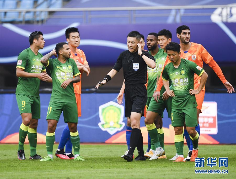 10月16日至19日,2020赛季中超联赛第15轮全部八场比赛战罢。在争冠组八进四首回合比赛中,广州恒大和河北华夏幸福率先登场。上半场尹鸿博世界波打破僵局,易边后吴少聪扳平比分,随后韦世豪造点、艾克森命中,韦世豪补时阶段头球再入一球,恒大3:1先下一城。本场比赛也是争冠组四场首回合较量中唯一取得胜负的比赛。在其它三场平局的较量中,山东鲁能泰山2:2战平老对手北京中赫国安;“上海德比”上海绿地申花与上海上港0:0握手言和;江苏苏宁与重庆当代1:1战平。在保级组的四场首回合较量中,率先出战的天津泰达迎来久违的胜利,以2:0战胜了深圳佳兆业。这是泰达本赛季的首胜,更为泰达在保级战中抢得先机。升班马石家庄永昌凭借37岁外援马修斯在第81分钟的进球,2:1逆转战胜大连人,在两回合的比赛中占据优势。河南建业1:0小胜武汉卓尔。青岛黄海青港与广州富力0:0战平。 山东鲁能泰山 2-2 北京中赫国安 10月17日,争冠组比赛在苏州继续进行,山东鲁能泰山迎战老对手北京中赫国安。双方各打出半场好球,得益于巴坎布下半场连入两球,一度落后的国安最终逼平对手。 开场后,攻击力不俗的国安主导场上节奏,鲁能则放弃高位逼抢、主动退守半场。久攻未果的国安率先丢球,第22分钟时,国安外援巴坎布在禁区防守时手球送点,佩莱主罚命中,鲁能一球领先。第36分钟时,鲁能突然改变防守节奏,多人前场围抢国安球员得手,随后蒿俊闵带球直插禁区、门前横传金敬道,后者轻松打空门得手。半场结束,鲁能2:0领先国安。 易边再战,国安首次进攻就获得点球机会,主罚的巴坎布骗过王大雷,将球打入球门上角,为国安追回一球。士气大振的国安随后用攻势压制住鲁能。第70分钟时,李磊左路起球斜传门前,又是巴坎布在两名鲁能中卫之间抢点头球破门,帮助国安扳平比分。 重回同一起跑线后,鲁能接连换上莫伊塞斯和刘彬彬来加强进攻。但球队整场表现不够稳定,尤其是传接球方面失误偏多。在比赛最后时刻,国安甚至还有机会改写比分,所幸王大雷发挥神勇高接低挡,2:2的比分被保持到终场哨响。 平局之后,两支球队谁能晋级下一轮,还要看10月22日双方次回合较量结果。 图为10月17日,主裁判沈寅豪(中)在比赛中执裁。 新华社记者季春鹏摄