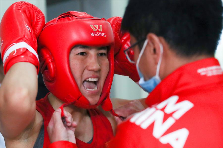 10月20日,河北九江队选手尹军花(左)在赛前佩戴护具。 当日,在河北省迁安市唐山九江体育中心进行的2020年“迁安杯”全国女子拳击锦标赛57公斤级四分之一决赛中,河北九江队选手尹军花以5比0战胜河南队选手阮木兰,晋级四强。 新华社记者 欧东衢 摄