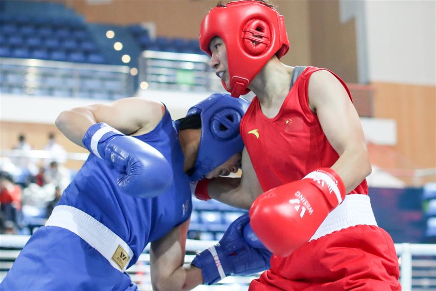 10月20日,四川队选手杨文璐(右)与重庆队选手古云云在比赛中。 当日,在河北省迁安市唐山九江体育中心进行的2020年“迁安杯”全国女子拳击锦标赛60公斤级四分之一决赛中,四川队选手杨文璐以5比0战胜重庆队选手古云云,晋级四强。 新华社记者 欧东衢 摄