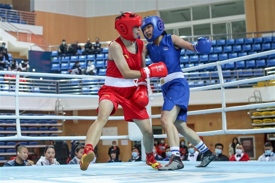 10月20日,四川队选手杨文璐(左)与重庆队选手古云云在比赛中。 当日,在河北省迁安市唐山九江体育中心进行的2020年“迁安杯”全国女子拳击锦标赛60公斤级四分之一决赛中,四川队选手杨文璐以5比0战胜重庆队选手古云云,晋级四强。 新华社记者 欧东衢 摄