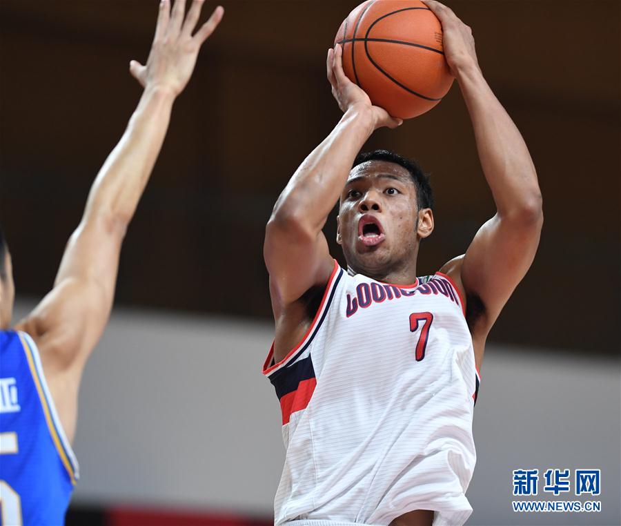10月22日,时代中国广州队球员祝铭震在比赛中投篮。 当日,在浙江诸暨举行的2020-2021中国男子篮球职业联赛(CBA)第一阶段比赛中,时代中国广州队以92比73战胜苏州肯帝亚队。 新华社记者 沙达提 摄