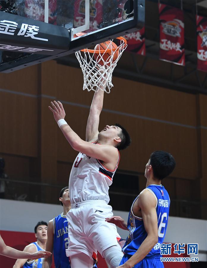 10月22日,时代中国广州队球员孙鸣阳在比赛中上篮。 当日,在浙江诸暨举行的2020-2021中国男子篮球职业联赛(CBA)第一阶段比赛中,时代中国广州队以92比73战胜苏州肯帝亚队。 新华社记者 沙达提 摄