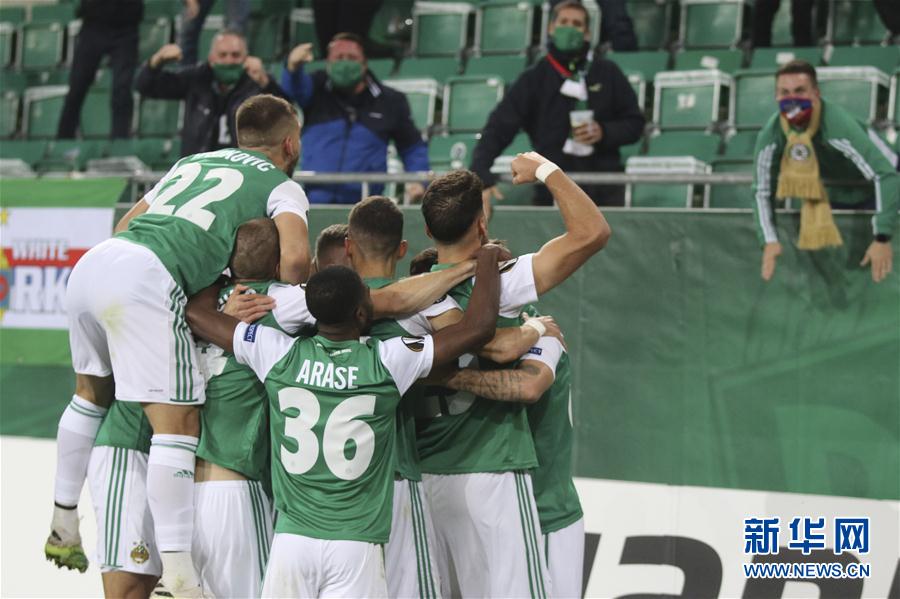 10月22日,维也纳快速队球员庆祝进球。 当日,在2020-2021赛季欧罗巴联赛小组赛B组首轮比赛中,英超阿森纳队客场以2比1战胜奥超维也纳快速队。 新华社/美联