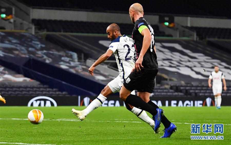 10月22日,热刺队球员卢卡斯·莫拉(左)在比赛中破门。 当日,在2020-2021赛季欧罗巴联赛J组小组赛首轮比赛中,英超托特纳姆热刺队主场以3比0战胜奥超林茨队。 新华社/路透