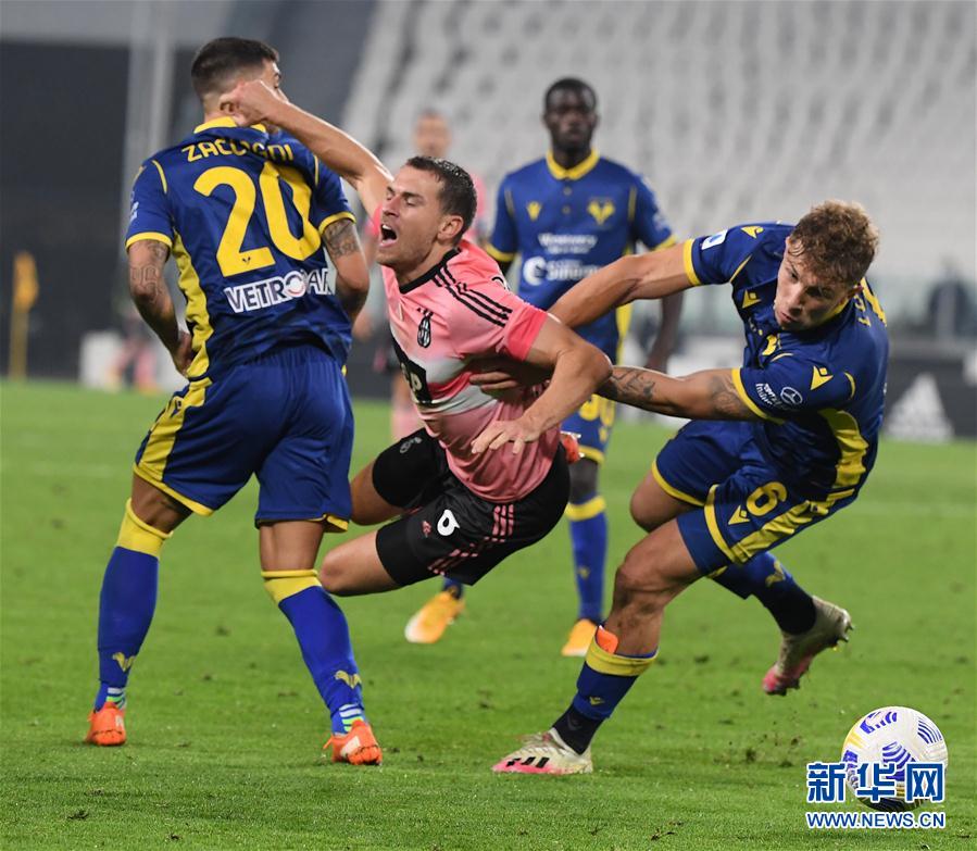 10月25日,尤文图斯队球员拉姆塞(中)与维罗纳队球员卡扎尼(左)、洛瓦托在比赛中拼抢。 当日,在2020-2021赛季意大利足球甲级联赛第五轮比赛中,尤文图斯队主场1比1战平维罗纳队。 新华社发(阿尔贝托·林格利亚 摄)