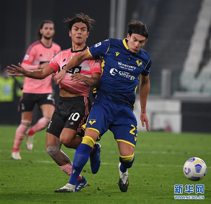 10月25日,维罗纳队球员马尼亚尼(右)与尤文图斯队球员迪巴拉在比赛中拼抢。 当日,在2020-2021赛季意大利足球甲级联赛第五轮比赛中,尤文图斯队主场1比1战平维罗纳队。 新华社发(阿尔贝托·林格利亚 摄)
