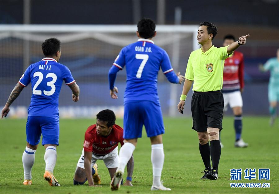 10月27日,主裁判郭宝龙在比赛中进行判罚。 当日,在2020赛季中国足球协会超级联赛(苏州赛区)第17轮比赛中,上海绿地申花队以3比1战胜重庆当代队。 新华社记者 许畅 摄
