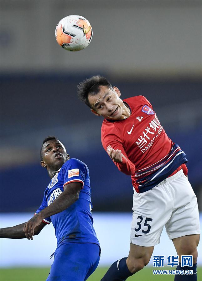 10月27日,重庆当代队球员陈杰(右)在比赛中与上海绿地申花队球员米勒·博拉尼奥斯争顶头球。 当日,在2020赛季中国足球协会超级联赛(苏州赛区)第17轮比赛中,上海绿地申花队以3比1战胜重庆当代队。 新华社记者 许畅 摄