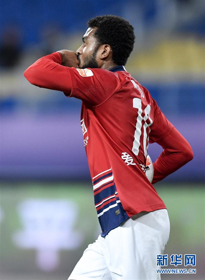 10月27日,重庆当代队球员西里诺在比赛中庆祝进球。 当日,在2020赛季中国足球协会超级联赛(苏州赛区)第17轮比赛中,上海绿地申花队以3比1战胜重庆当代队。 新华社记者 许畅 摄