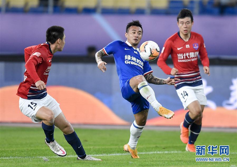 10月27日,上海绿地申花队球员柏佳骏(中)在比赛中传球。 当日,在2020赛季中国足球协会超级联赛(苏州赛区)第17轮比赛中,上海绿地申花队以3比1战胜重庆当代队。 新华社记者 许畅 摄