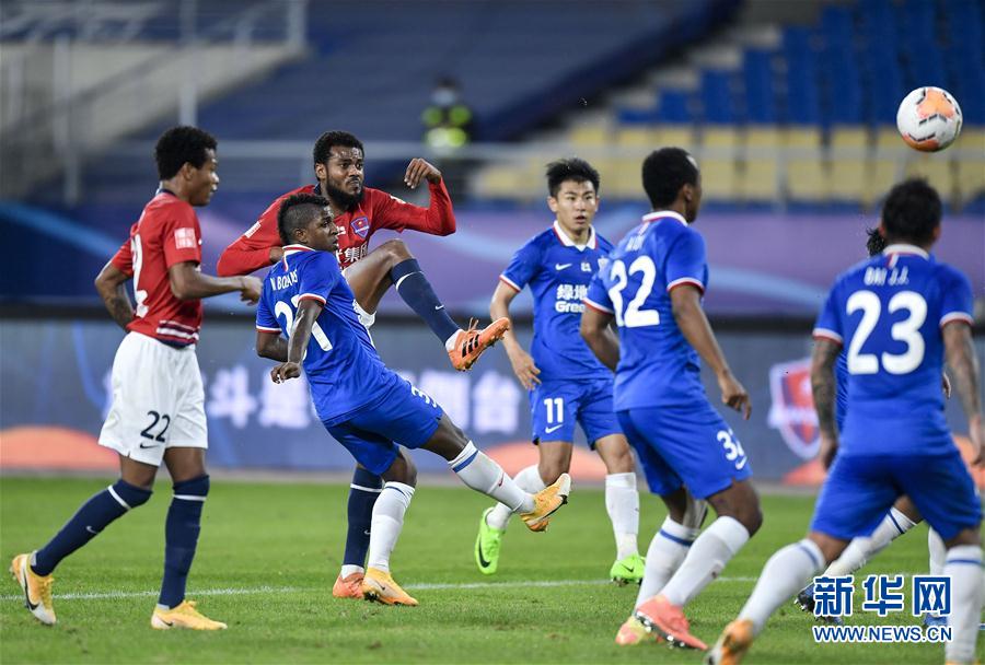10月27日,重庆当代队球员西里诺(左三)在比赛中射门。 当日,在2020赛季中国足球协会超级联赛(苏州赛区)第17轮比赛中,上海绿地申花队以3比1战胜重庆当代队。 新华社记者 许畅 摄
