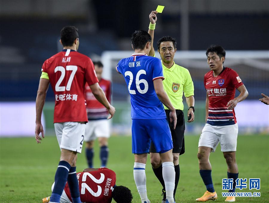 10月27日,主裁判郭宝龙(右二)向上海绿地申花队球员秦升(中)出示黄牌。 当日,在2020赛季中国足球协会超级联赛(苏州赛区)第17轮比赛中,上海绿地申花队以3比1战胜重庆当代队。 新华社记者 许畅 摄