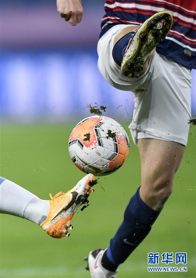 10月27日,上海绿地申花队球员朱宝杰(下)在比赛中与对手进行拼抢。 当日,在2020赛季中国足球协会超级联赛(苏州赛区)第17轮比赛中,上海绿地申花队以3比1战胜重庆当代队。 新华社记者 许畅 摄