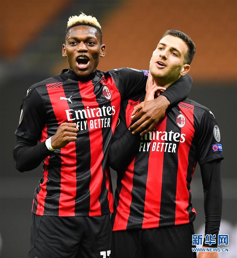 10月29日,AC米兰队球员达洛特(右)在进球后与队友莱奥庆祝。 当日,在2020-2021赛季欧罗巴联赛小组赛H组第二轮的一场比赛中,意甲AC米兰主场以3比0战胜捷甲布拉格斯巴达队。 新华社发(阿尔贝托·林格利亚摄)