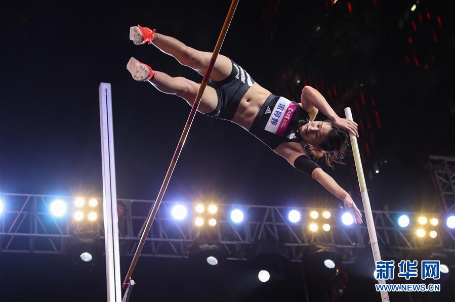 10月29日,安徽队选手宋婷婷在女子撑杆跳高比赛中。宋婷婷以4米10的成绩获得亚军。 当日,中国田径街头巡回赛成都站撑杆跳高比赛在成都春熙路举行。 新华社记者 江宏景 摄
