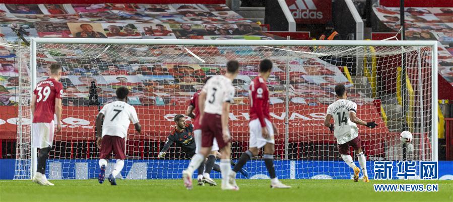 11月1日,阿森纳队球员奥巴梅扬(右一)在比赛中主罚点球命中。 当日,在2020-2021赛季英格兰足球超级联赛第七轮比赛中,曼彻斯特联队主场以0比1不敌阿森纳队。 新华社发