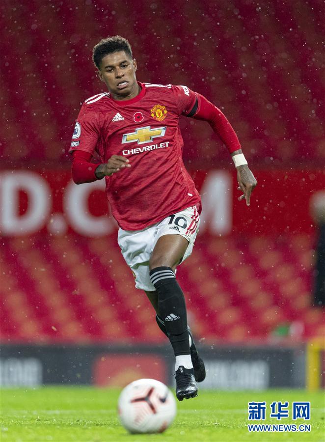 11月1日,曼联队球员拉什福德在比赛中带球突破。 当日,在2020-2021赛季英格兰足球超级联赛第七轮比赛中,曼彻斯特联队主场以0比1不敌阿森纳队。 新华社发