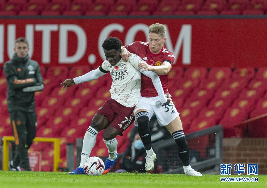 11月1日,阿森纳队球员萨卡(前左)与曼联队球员麦克托米奈(前右)拼抢。 当日,在2020-2021赛季英格兰足球超级联赛第七轮比赛中,曼彻斯特联队主场以0比1不敌阿森纳队。 新华社发