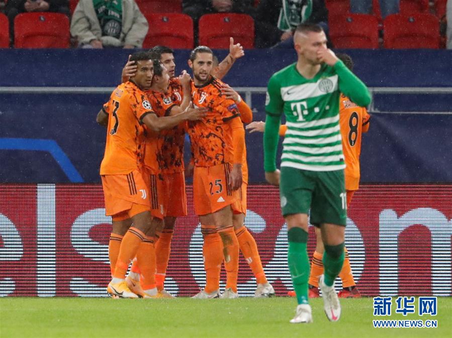 11月4日,尤文图斯队球员莫拉塔(左三)在打入本队第一粒进球后和队友庆祝。 当日,在2020-2021赛季欧冠联赛小组赛G组第三轮比赛中,意大利尤文图斯队客场以4比1战胜匈牙利费伦茨瓦罗斯队。 新华社/路透