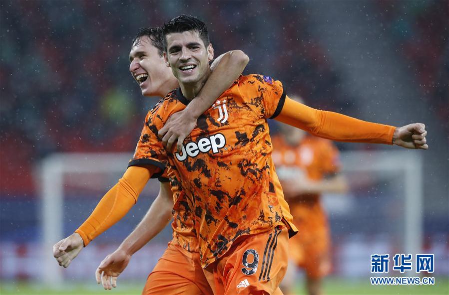 11月4日,尤文图斯队球员莫拉塔(右)在打入本队第二粒进球后庆祝。 当日,在2020-2021赛季欧冠联赛小组赛G组第三轮比赛中,意大利尤文图斯队客场以4比1战胜匈牙利费伦茨瓦罗斯队。 新华社/路透