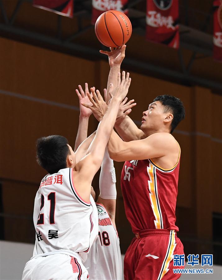 11月5日,山西汾酒股份队球员吴轲(右)在比赛中投篮。 当日,在浙江诸暨举行的2020-2021赛季中国男子篮球职业联赛(CBA)第一阶段第九轮比赛中,广东东莞大益队以131比106战胜山西汾酒股份队。 新华社记者 沙达提 摄